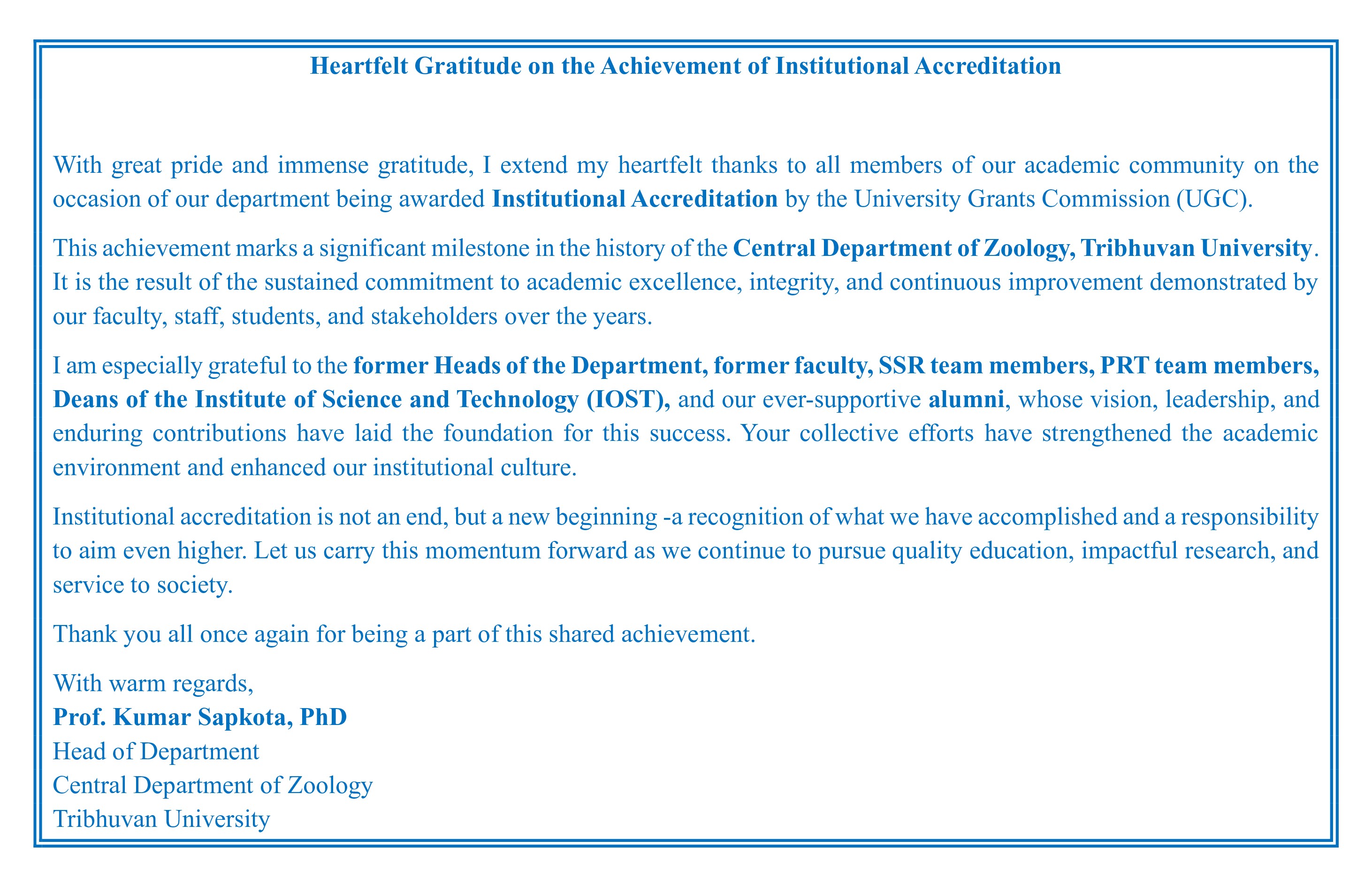 Heartfelt Gratitude on the Achievement of Institutional Accreditation